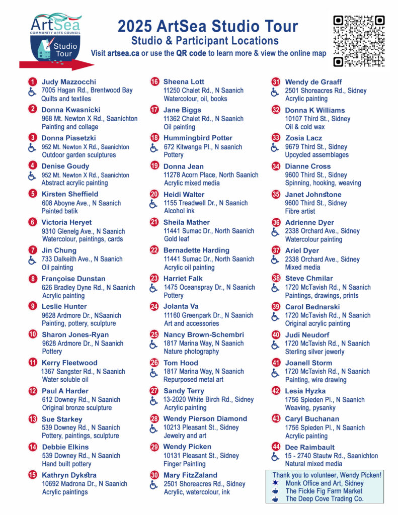 - A single-page, 8.5″ x 11″ printed guide will also be produced. It will include a list of participants with artist name, address, artist medium (as provided on the application form), and a corresponding numbered dot showing the approximate studio locations on a map of the Saanich Peninsula. A limited number of printed guides will be distributed to designated locations on the Saanich Peninsula and Greater Victoria. This document will also be available for download/personal printing on the ArtSea website (artists that would like additional hard-copies are welcome to download the PDF and print/distribute as needed).
