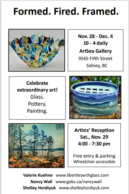 Exhibition Details: Celebrate the Season through the hands and visions of talented local artists Nancy Wall, Valerie Kuehne, and Shelley Hordiyuk in this joyful exhibition. Formed. Fired. Framed. brings together the warmth of handmade pottery, the brilliance of glasswork, and the expressive beauty of painting – three distinct mediums, united in festive spirit.